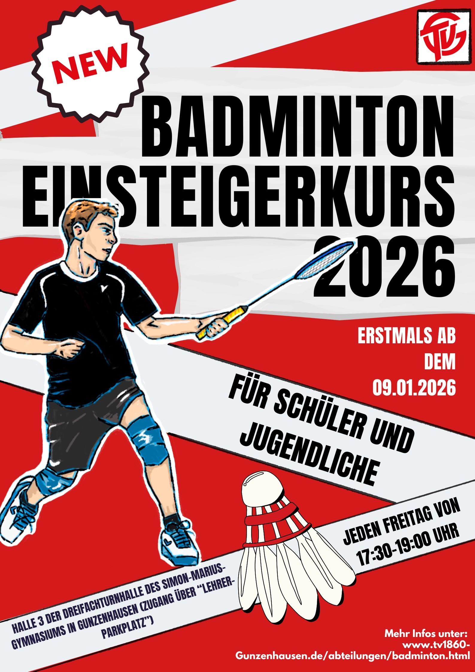 Auch der neue Einsteigerkurs 2026 findet wieder in “unserer” Dreifachturnhalle am Simon-Marius-Gymnasium in Gunzenhausen (Halleneinheit III) statt. Zugang von der Simon-Marius-Straße her (über den sog. Lehrerparkplatz).
