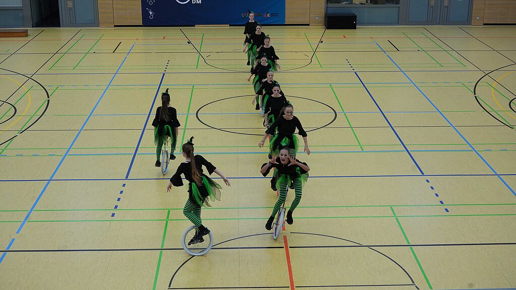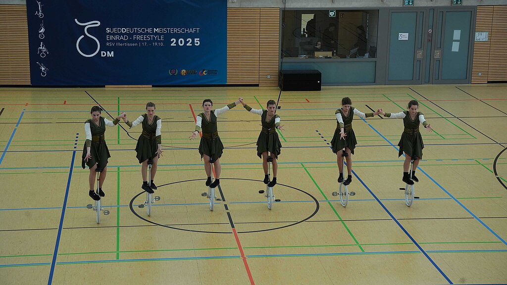 Wie bei Einrad-Wettkämpfen üblich, gehörte der Sonntagnachmittag den Gruppenküren in einer sehr gut besuchten Halle. Als eine von acht Küren konnte das sechsköpfige Fahrerinnenteam aus Gunzenhausen mit Smilla Engelhardt, Felicia Hüttinger, Mira Hüttinger, Susanne Reisnecker, Emma Stark und Milena Trautner erneut „The tale of Robin Hood“ in der Kategorie Kleingruppe Expert präsentieren. Mit viel Kreativität und Liebe zum Detail wurde die Kür von Susanne Reisnecker choreografiert und mit Tricks auf hohem Niveau gestaltet. Nach einem ausdrucksstarken und mit großer Begeisterung gefahrenen Durchgang landete die Gruppe auf dem sechsten Platz.